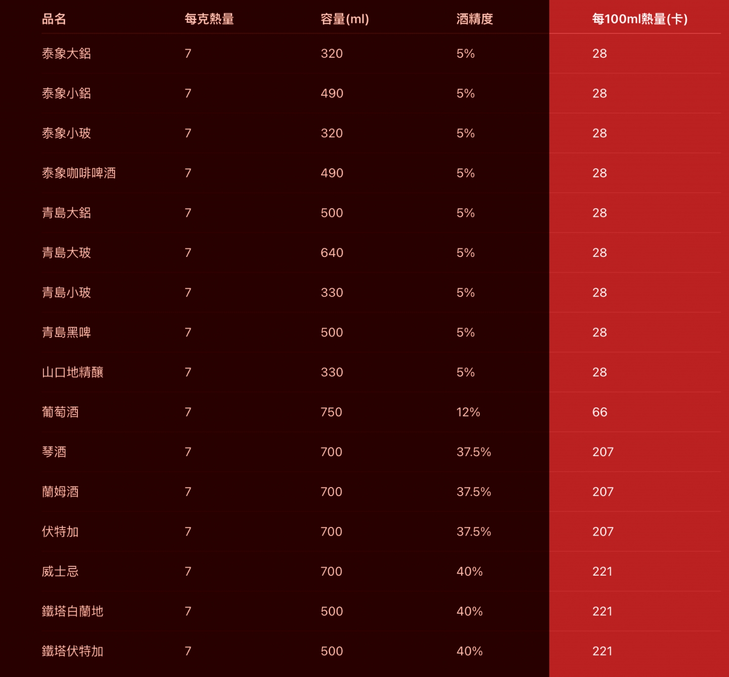 此表格為大致參考值,不同酒款可能會有不同差異,