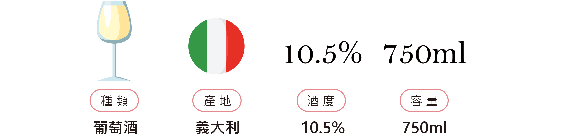 帶有微微的白色花香,酸度順口易飲,是一款清新優雅的經典百搭白酒。